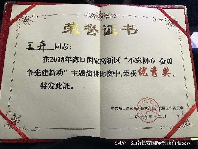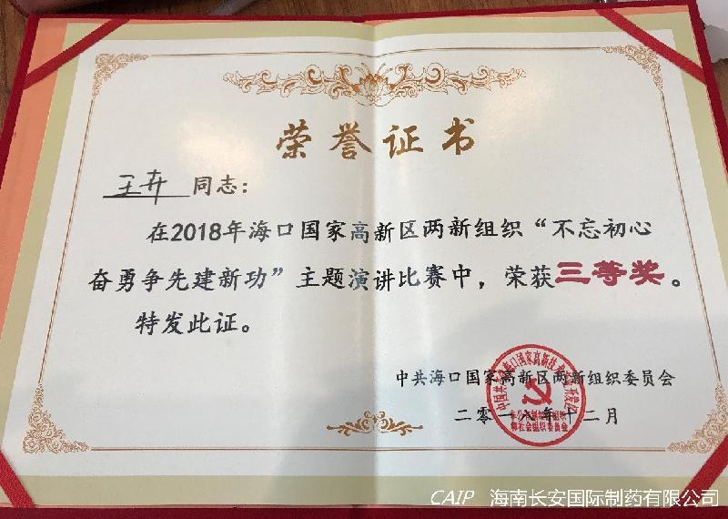 中共海南長(zhǎng)安國(guó)際制藥有限公司黨支部積極響應(yīng)高新區(qū)兩新組織黨委號(hào)召參加此次演講活動(dòng),并取得了三等獎(jiǎng)及優(yōu)秀獎(jiǎng)的好成績(jī)。